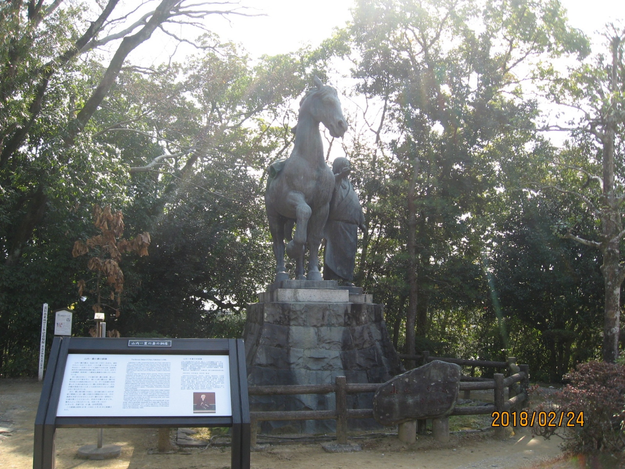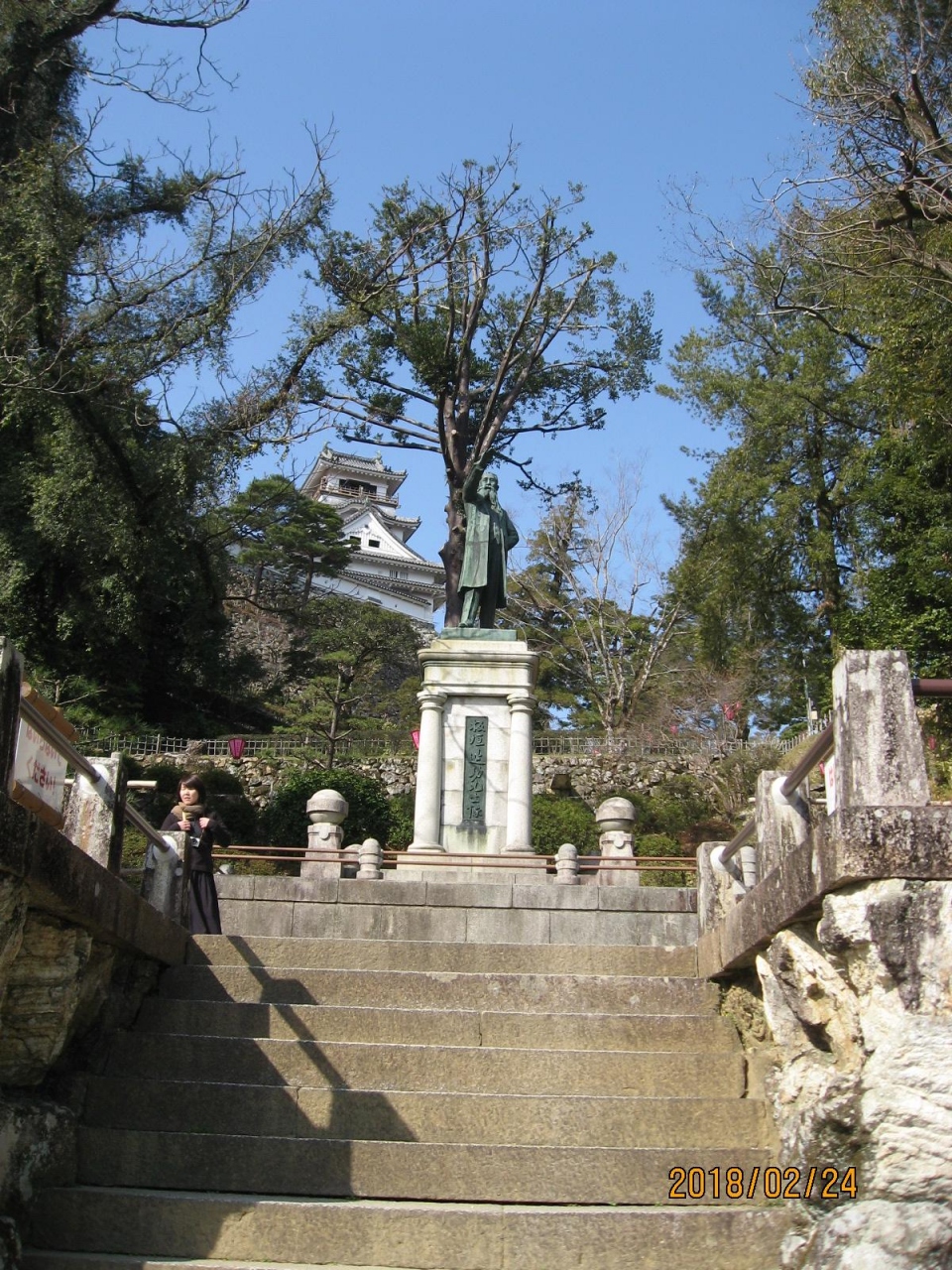 追手門を入り、石段を上った右手にたっています。養父母が残してくれた10両で信長の馬揃えの時、夫一豊に名馬を買い与え、夫の出世に貢献したエピソードが題材となって、千代(妻)が馬をひく像がたてられたのでしょう。とても興味深く、見入ってしまいました。