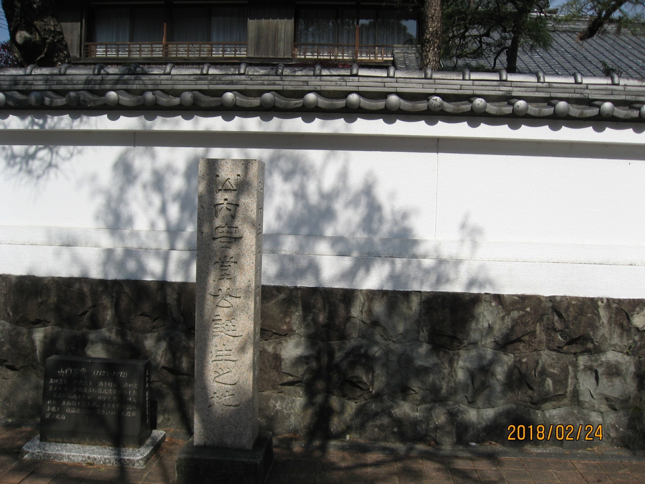 幕末に将軍徳川慶喜に対して、大政奉還を進言したことで知られる土佐藩主山内容堂の生誕地に建つ石碑です。観光客が多く訪れる高知公園近くの道路わきにたち、背景の白壁や落ち着いた街並みとよく調和し、いい雰囲気を漂わせています。