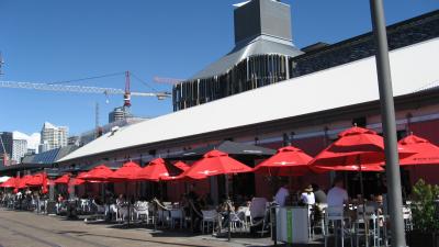 オークランドフェリーターミナルから西へ歩き、ヴァイアダクトハーバーとウィンヤードクロッシングを越えたところが、ウィンヤードクォ―ターです。右手すぐのところにイベントセンターがたち、まっすぐ西へ進むと、左側に倉庫風のカフェやレストランがたち並んでいます。多くの店ではテラス席が設けられ、飲食を楽しむ地元の人たちでとてもにぎわっていました。