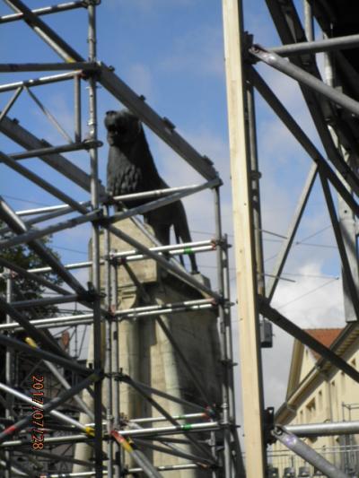 ブラウンシュヴァイクは、12世紀に北ドイツを支配していたハインリヒ獅子公の居城のあったところとされています。ハインリヒ獅子公と王妃マチルダの棺が安置される大聖堂が面するブルク広場にこのハインリヒ獅子公を象徴するライオン像がダンクヴァルデ城の方を向いて置かれています。この時は、ブルク広場全体が、工事中でライオン像も組まれた足場の中に入っていました。