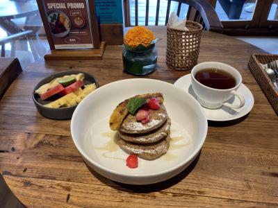 最終日の朝、ホテル横のカフェでパンケーキをいただきました。