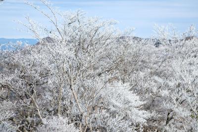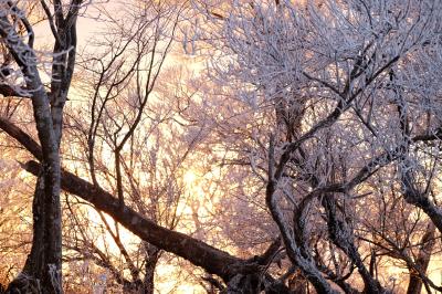 淡い朝の光の中、小枝にまとわりつく霧氷。夜半から今朝、日の出前に気温が...