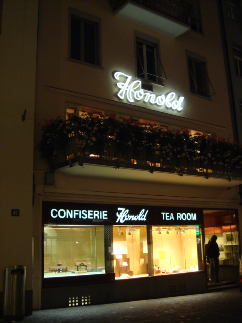 場所は、チューリッヒ中央駅を背にしてBahnhofstrasseをまっすぐ進み、左手にEnglish Book Storeが見えたらそこを左折します。少し歩けば右手にTea Roomと書かれたお店があり、そこがHONALDです。ガラス越しに美味しそうなケーキが陳列されているのですぐに分るかと思います。因みに正面はスターバックスです。