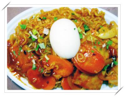 トッポッキにラーメンの麺を入れ野菜とゆで卵も入っています。汁物ではありません。
