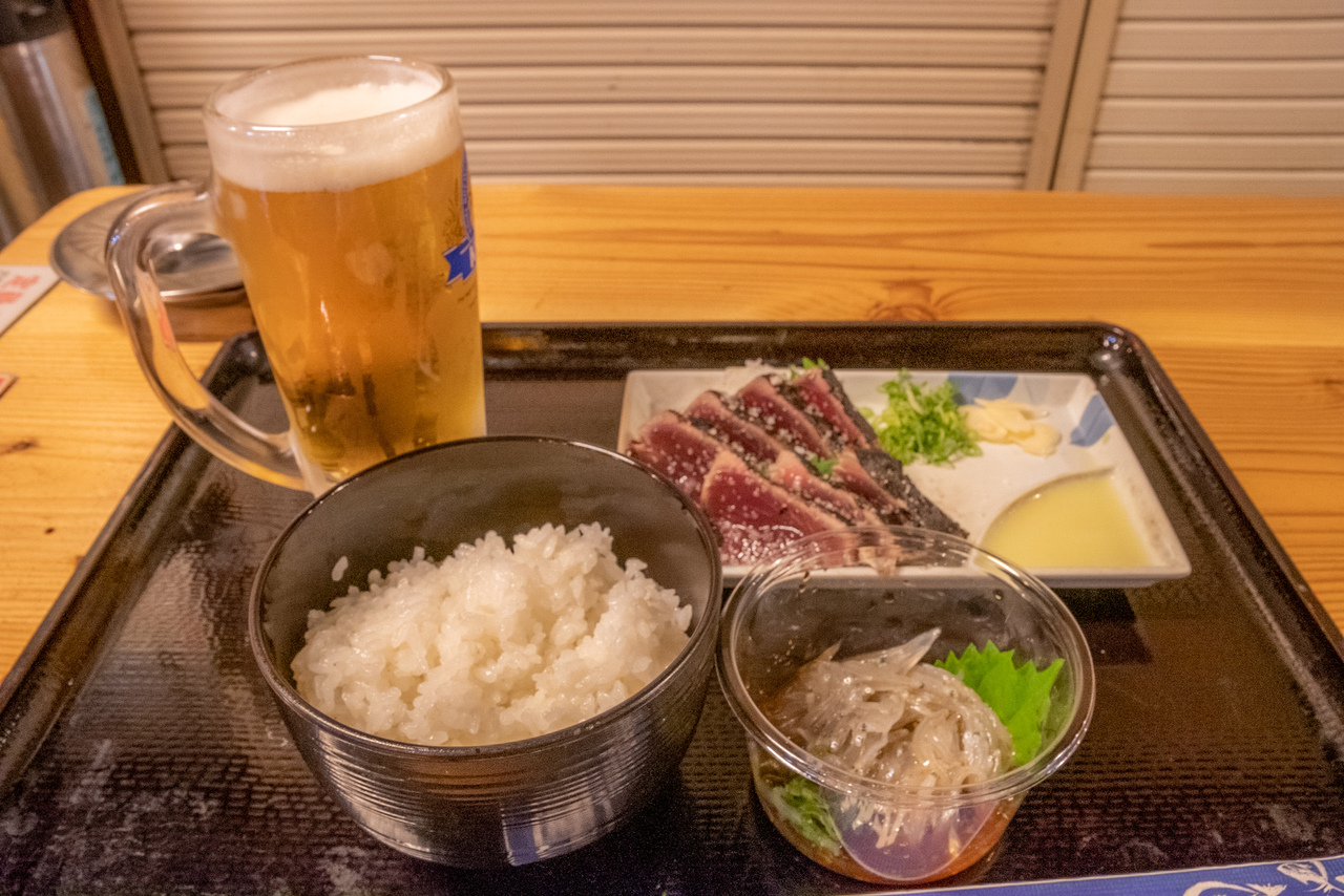 一番人気のこちらのお店でカツオのたたきビールセット、どろめを注文。