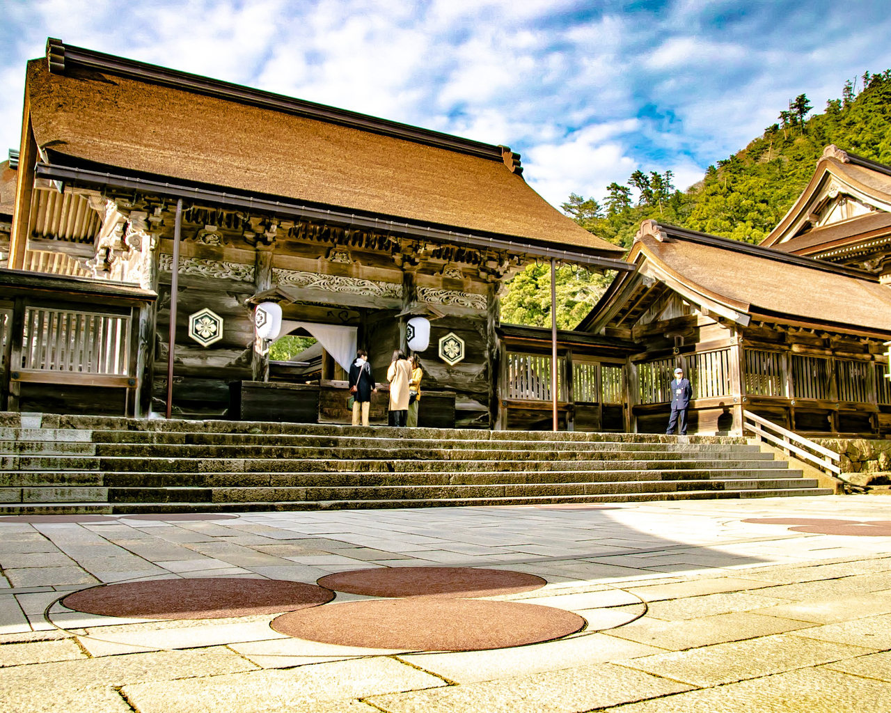 拝殿後ろ手にある大社造りの御本殿。日本最古の神社建築様式で国宝にも選ばれています。