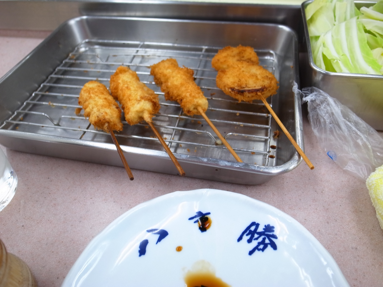 大阪新世界でいつも飛び抜けて長蛇の列ができているお店。一列で納まりきれずに2列になっているときもしばしば。いつも気になっていましたが、串カツで30分とか並ぶのはどうかな~という思いから躊躇していましたが、機会があって挑戦してみました。待つこと20分ほどで店内へ、まずレモンサワー(400円)注文のあと、名物串カツ(3個300円)をオーダー。う~ん、普通かなという印象。そのあともネギ(100円)、ししゃも(200円)、アスパラ(200円)、かぼちゃ(100円)、えび(400円)と試すも、そんなに感心しない。あなご(200円)とトマト(100円)はおいしかったかな。期待が過剰だったせいもあるけど、並んでまで食べるものでは…というのが率直な感想。リーズナブルだし、無論おいしくなわけでは無い。