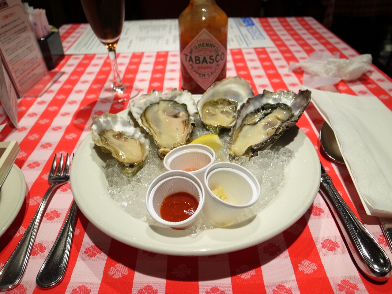 明治生命館の地下にあるお店。ニューヨークの本店よりかは一回り小さいですが、本番と同じような雰囲気が楽しめる店。今回ランチで入店しました。1600円のコースと生ガキのセットをオーダーしました。4ピースで1800円と、安くわないですが、産地の違う4つの生ガキは絶品です。ロゼのスパークリングワインと相まっておいしかった。