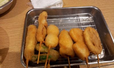 大阪新世界で一番有名と言っても過言ではない、元祖串かつ屋。午後7時ぐらいにいきましたが、お店には行列ができていました。新世界の界隈に何店舗かありますが、どこも常に行列ができています。(9時以降遅い時間に訪問すると比較的空いていることが多いように思います。)それもそのはず、なんと言っても安い。ほとんどの商品は一品105円なので懐が痛みません。アルコール類の種類は少なかったのでもう少し多いほうがよかった。