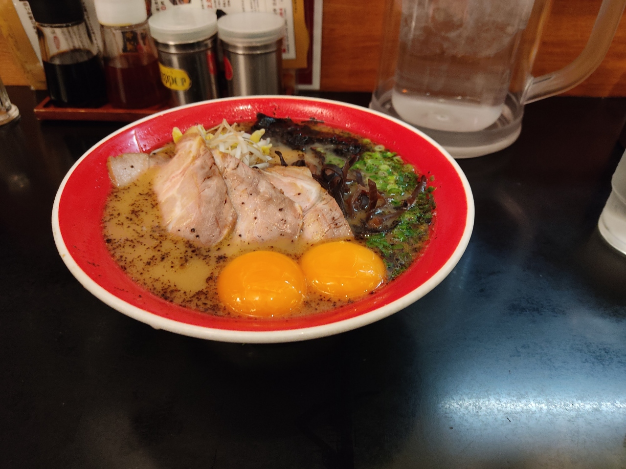 熊本の人気ラーメン店、黒亭の本店がこちら。アクセスしづらい場所にある。あまり用事のない熊本駅からは徒歩10分、熊本城近辺からだと30分ぐらいかかるかも。ラーメンの見た目は食欲をそそるが、そこまでうまいものでもないかも。