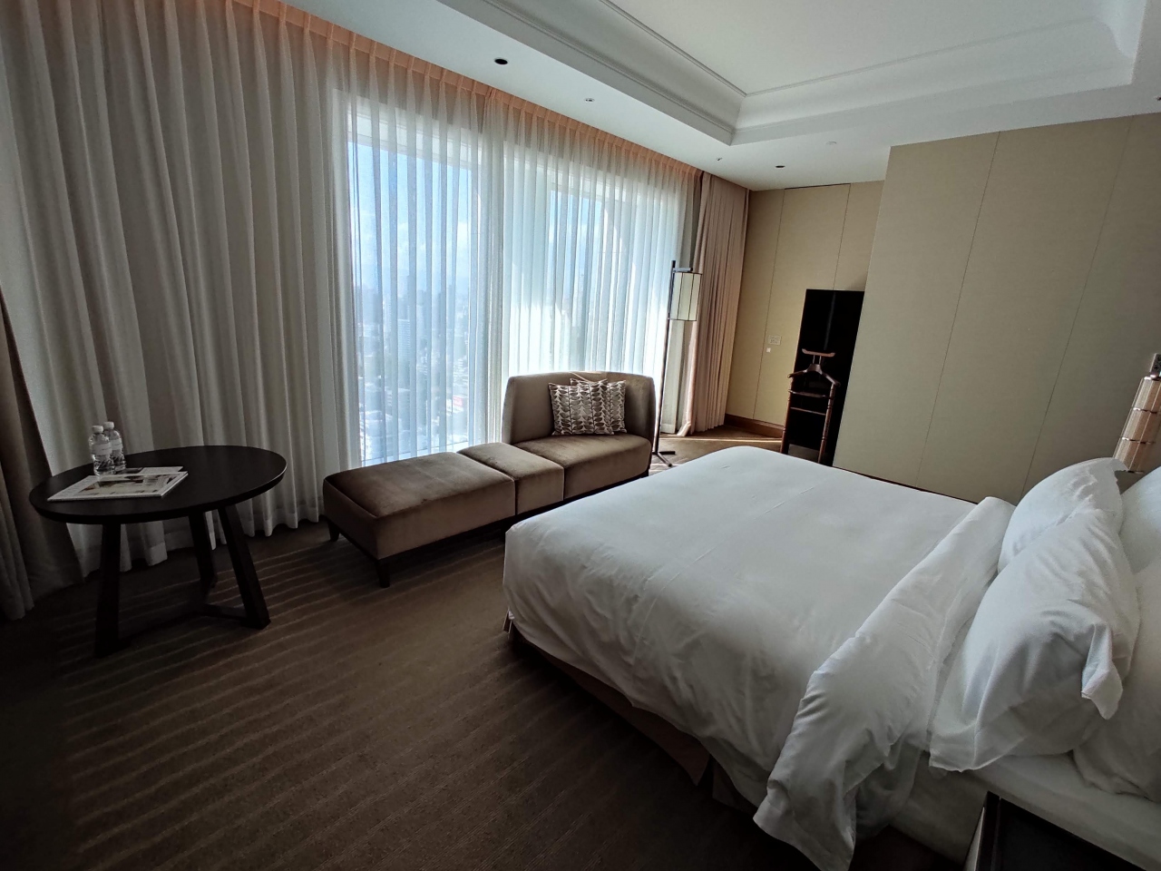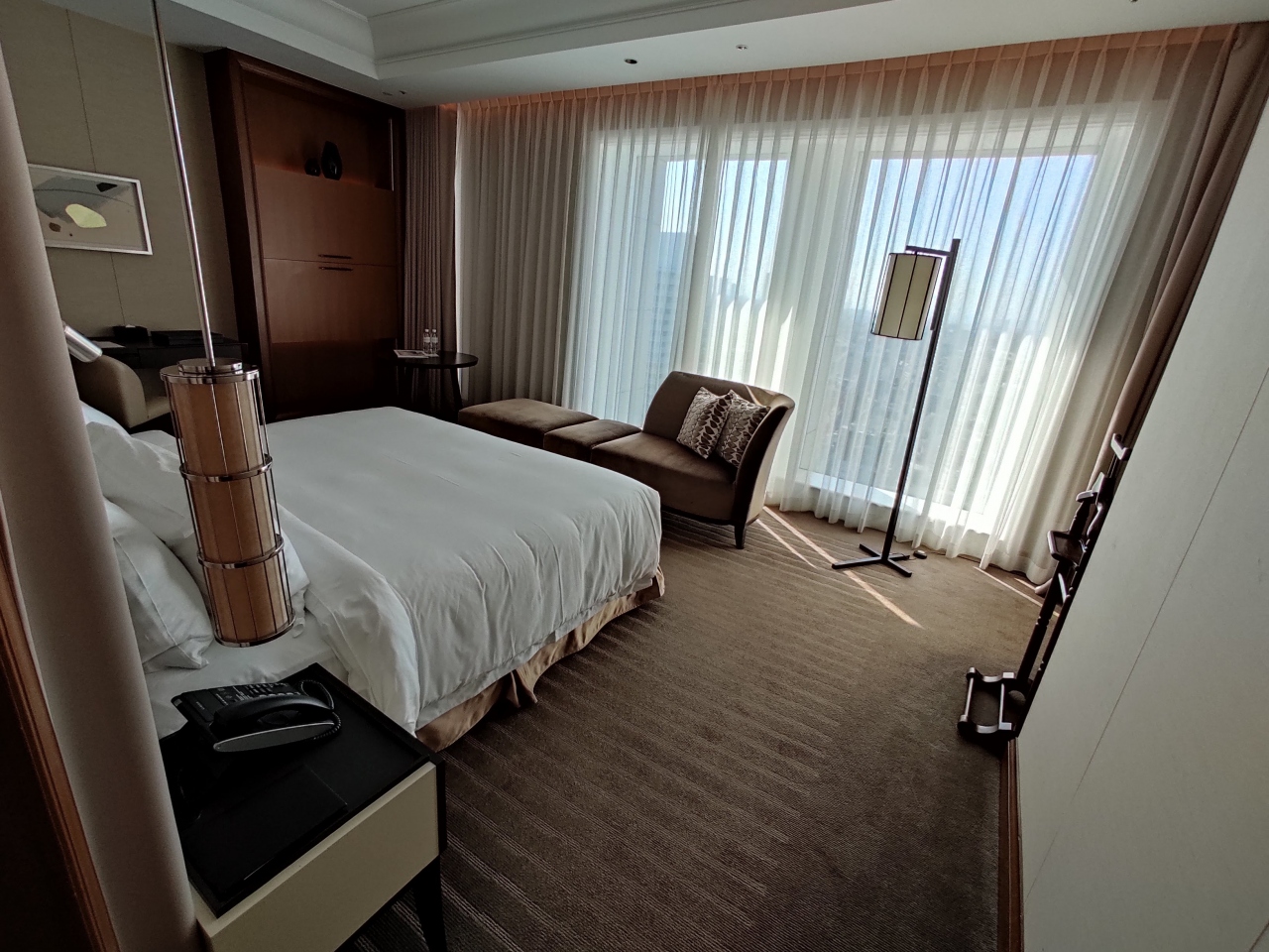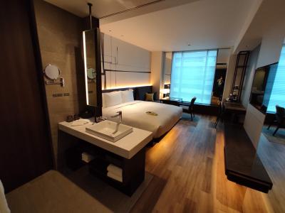 憧れのホテルの一つでしたが昨今の情勢も加味して大変格安で宿泊出来ました。27階と高さはあるがそれほど客数は多くなく、ロビーも小ぶりなホテルです。それ故バトラーサービスなど行き届いたサービスが特徴。お部屋はセントレジススタンダードで高級感はありますが、開業10年経過していることもあり結構傷んでいたりします。最上階であったためマリオット大阪ほどではないですが夕焼け、夜景も良かったです。バーも秀吉の茶室をイメージしている?のか内装もサービスも良かった。プラチナ以上はミニバー3千円まで無料だが、単価がたかいのであっという間に使いきるw ワイシャツ等2枚までアイロンがけ無料。海外ではよく見るが、日本では珍しい。説明はなかったが靴磨きのサービスもある模様。珈琲の味はいまいちだな。また折に触れてちょくちょく泊まるのもいいと思った。