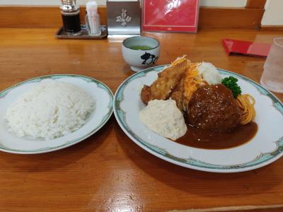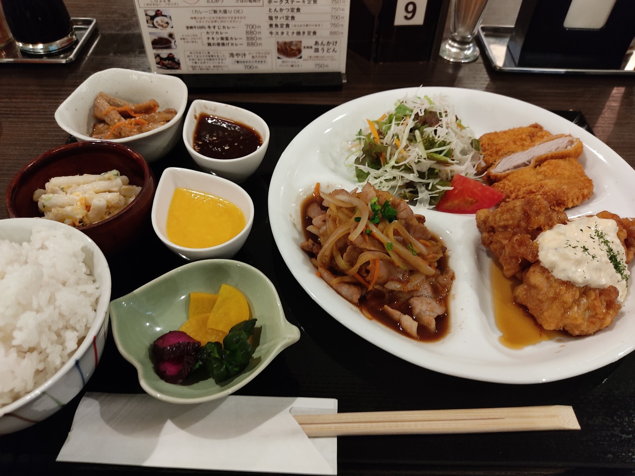 宮崎の橘通りの裏手にあるレストラン。食堂と名のつくとおり庶民派で、ランチの定食は820円だったが色々てんこ盛り。まずいろいろな種類な主品から3つ選べる。ご飯も大盛り無料。かなりのボリュームです。店内ではwifiも無料。
