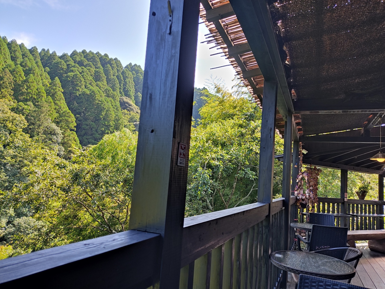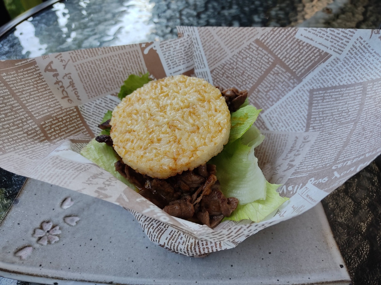 天岩戸神社からら天安河原に向かう道沿いにあった軽食屋さんです。店内の奥はその名の通りテラスになっています。これが結構気持ちいい。マンゴーのジュースとか高千穂牛を使ったホットドッグ、ライスバーガーなどありました。味は普通。