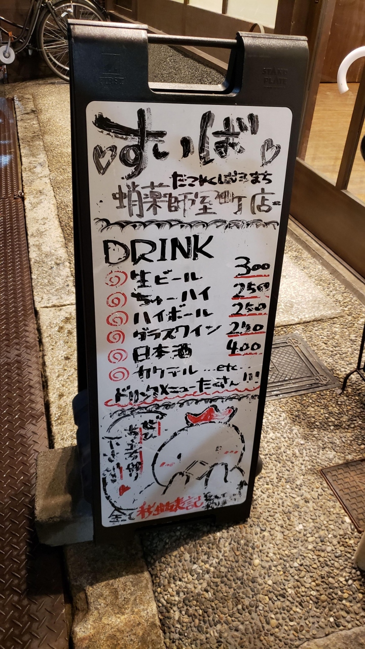 観光客というより地元客でにぎわう立ち飲み居酒屋。最低1ドリンク、1プレートからのオーダーで、ちょっと一杯気軽に入れる。料理もおいしかったし、サービスも悪くない。何万円もする料亭よりもこのような庶民のお店の方が京都の"今"をよく体現していると思う。