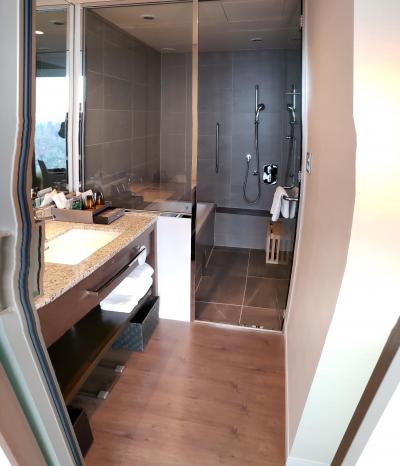 マリオットのフリーナイトアワードにて無料宿泊しました。アーリーチェックイン+例とチェックアウトの合わせ技で12時~翌4時まで滞在しました。お部屋は38平米と広くはないですが、最上階(55階)の部屋だったので眺めは最高。アメニティ、装備ともに新しく快適でした。特筆すべきはラウンジサービスで提供される食事はどれもおいしかったです。またえてしてビジネスライクな対応の目立つシティホテルにあってもスタッフの礼儀正しい対応は素晴らしいと思いました。ラウンジ内の雰囲気もサイコーです。また泊まりたいけどネックはやはり価格ですね。2万円ちょいぐらいならいいのになあ。