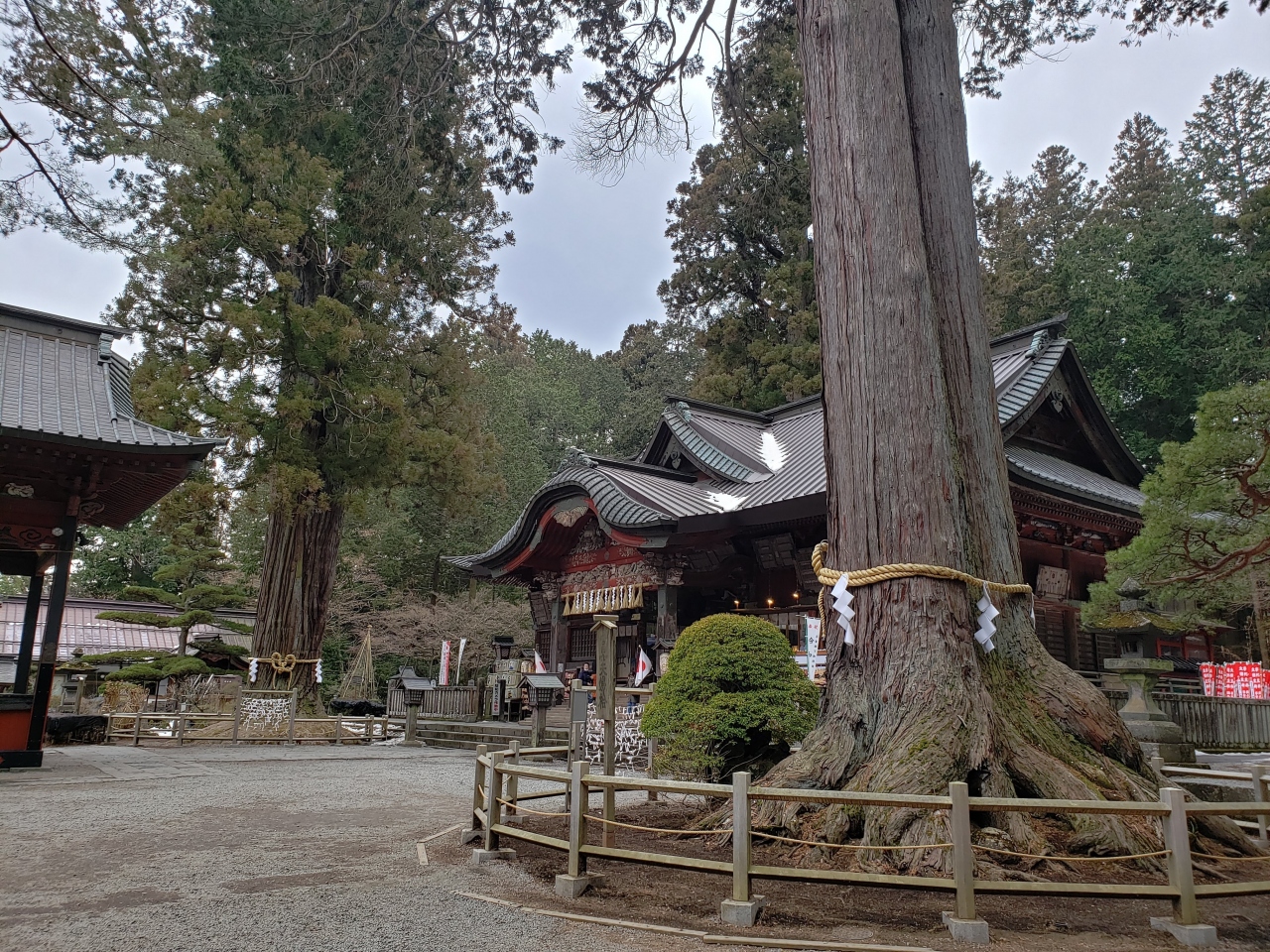 巨木が多いことで有名な北口本宮。富士山駅から徒歩で行ってみたら20分ぐらいかかってしまった。数ある冨士浅間神社でナンバーワンの呼び声にふさわしく、どれも見ごたえのあるものでした。中でも本殿の両隣に立つ樹齢千年ともいわれる杉とヒノキの巨木は圧巻でした。ぜひ夏にも見てみたいな~