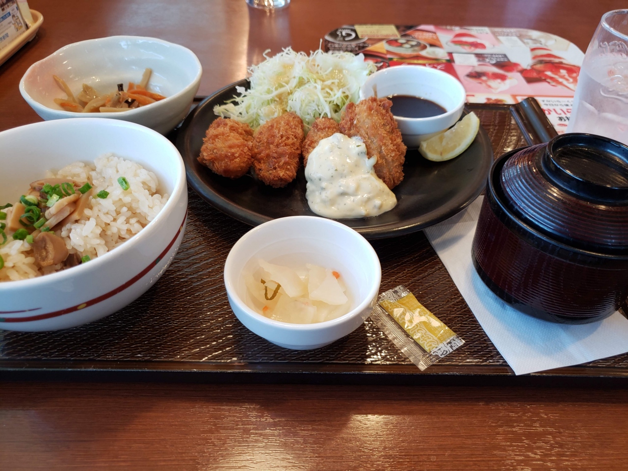 ご当地メニューシリーズがおいしそうだったので、久々に訪問。2時過ぎの訪問でしたが、結構な混雑でした。広島牡蠣フライ+松茸ご飯定食で1200円。松茸ご飯はちょっと硬かったが、カキフライはおいしかったです。