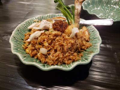 どこのガイドブックにも出てくるアフタヌーンティーのお店。エラワン廟となりにあり、利便性の高さが魅力。食事はあまり期待してなかったが思いのほかうまかった。(写真はカニチャーハン)JCB決済で15%offとなるのでここでの決済は一択でしょう!!