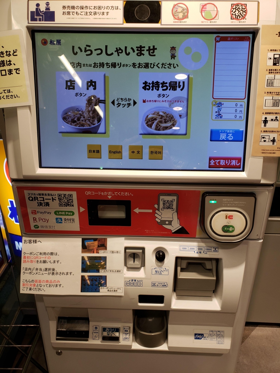 ついに松屋もQR決済に対応したため、早速訪問しました。こちらの店舗は最新式で、セルフサービス形式に代わっていました。マシーンでチケット購入し、カウンターで受け取る、食後は返却口まで返却するスタイルです。お水もセルフになります。効率的でよいかと思います。定食のサラダの具材が簡略化されていたのがきになるところ。