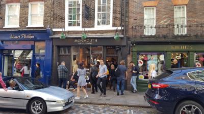 イギリスは紅茶文化とはいけ、やはりブラックコーヒーはうまくない。エクスプレッソに水を加えただけというのが多いので、味が薄く飲めたものではない。スタバだろうがどこだろうが、そういった点ではあまり大差がない。だがこちらのコーヒーは上質な豆をフィルターで丁寧に蒸しており、コーヒー豆の甘みすら感じるおいしいコーヒー。非常に混んでいるため、店内で飲むのはなかなか厳しい。