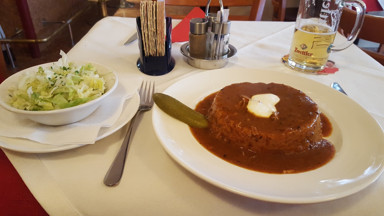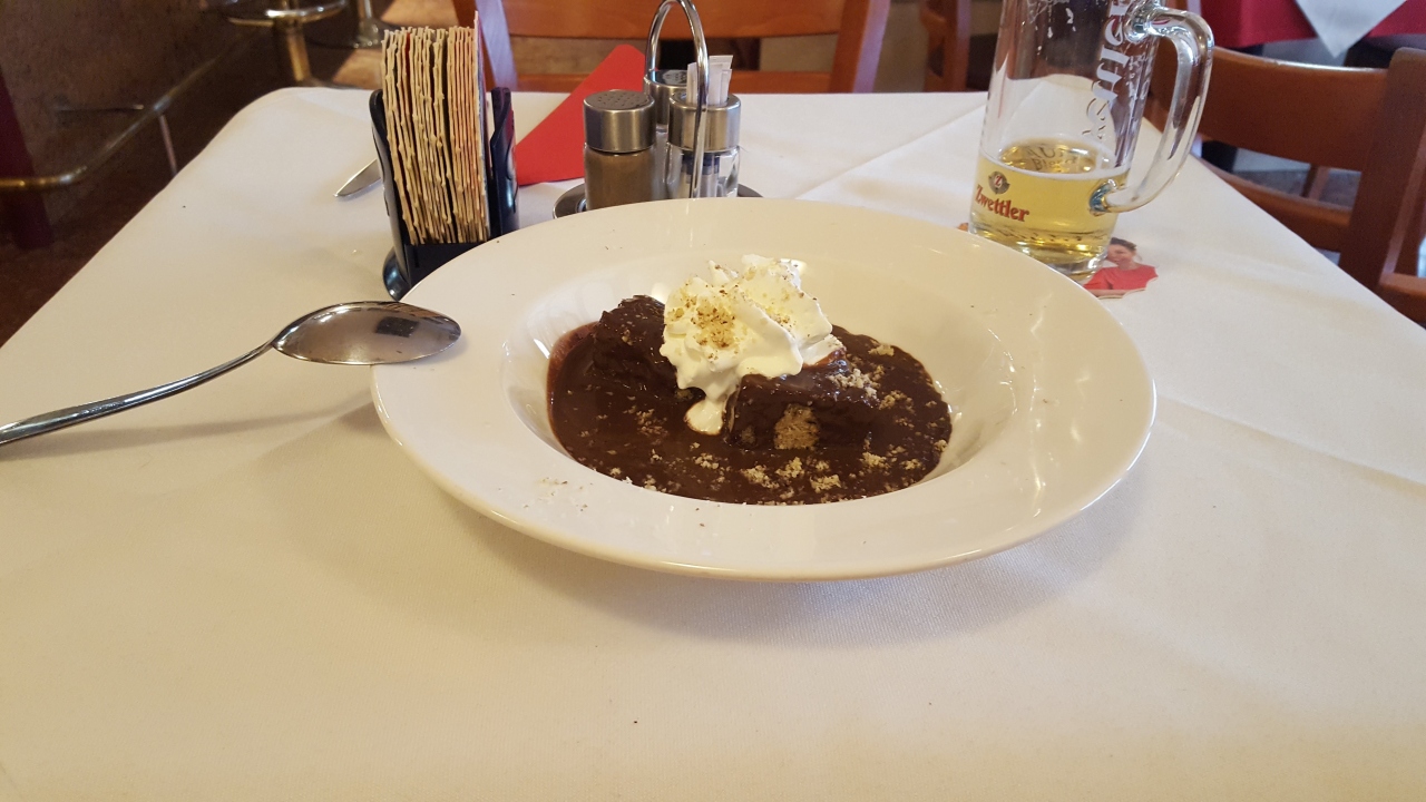 グラーシュと呼ばれる煮込み料理を提供する店。ガイドブックに載っていて、ホテルから近かったのでふらりと行ってみました。ランチはセットメニューやっていてくれて、スープ、メイン、デザート3皿で12ユーロぐらいとなかなか良心的なお値段。これにビールとチップ払っても18ユーロぐらい。他のレストランに比べてコスパ良すぎ。味も申し分なかったです!