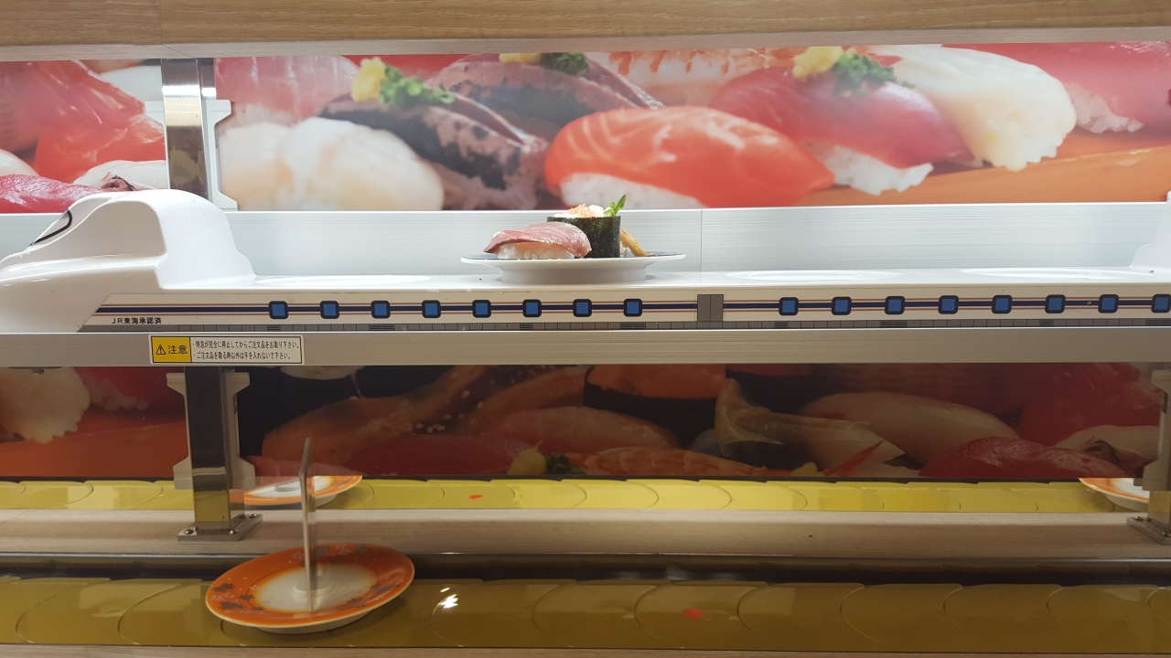 巣鴨地蔵通りにある回転すしチェーン。座席のパネルからオーダーすると通常レートとは別に特急でオーダー品が運ばれてくる仕組みのため、外国の観光客が喜びそう。特定のネタが割引になっている制度があるため、割引になっているものはお得だだが、それ以外は割高な価格設定。