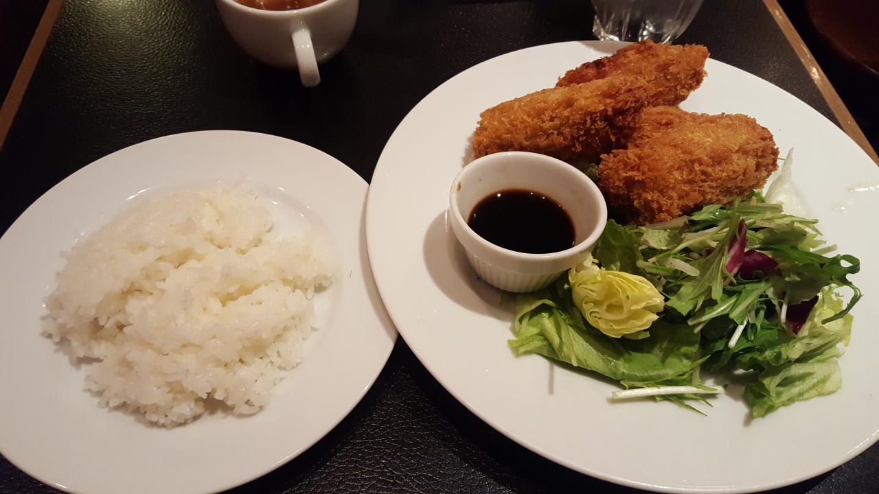 日替わりランチセットが700円で食べられるのでお昼時は混雑している。訪問した時は牡蠣フライを提供していた。さらに、13時以降に入店すると100円のドリンクメニューも無料でつく。味も悪くないので、コスパ最強ですね。