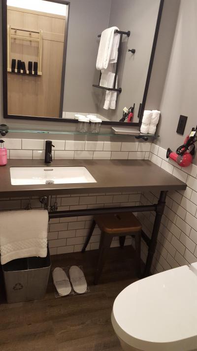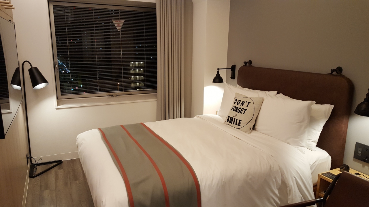 1泊込みこみで11000円程度で宿泊。錦糸町のラブホ街の真っただ中にあるぶっ飛んだホテル。他チェーンでいえばWやアロフト、インディゴにコンセプトが近い。いわゆるデザインホテルで、ブルックリンにありそうなオシャレブティク。高級感はありませんが木目調の内装は落ち着く。高架線に面しているのでおとが若干気になる。耳栓持参をおすすめする。マリオット上級会員でもアップグレードはないが、高層階、角部屋で、いい部屋をあてがってくれている感じはした。(そう信じたい)水回りは浴槽なしでシャワーだけ。ベットはフカフカでよかった。バーでのんだクラフトビールはとてもおいしかった。賛否両論あるホテルだが、ショートステイなら気分転換に なってよいと思う。