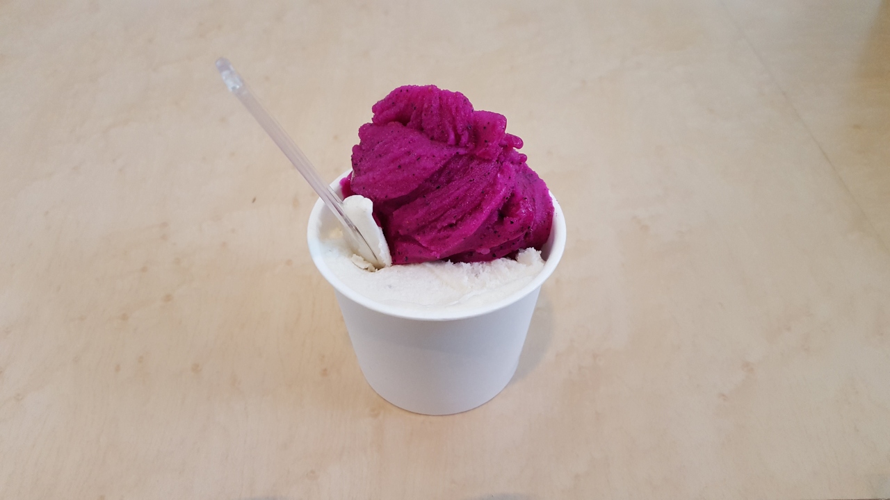 石垣島空港で飛行機の時間を待つ間に試してみた。370円で2種類選んでハーフ&ハーフできるのはうれしい。味はごくごく普通かな。石垣島のフルーツを生かした濃厚アイスをきたしたがちと当てが外れた。電子マネー使えるのがうれしい。