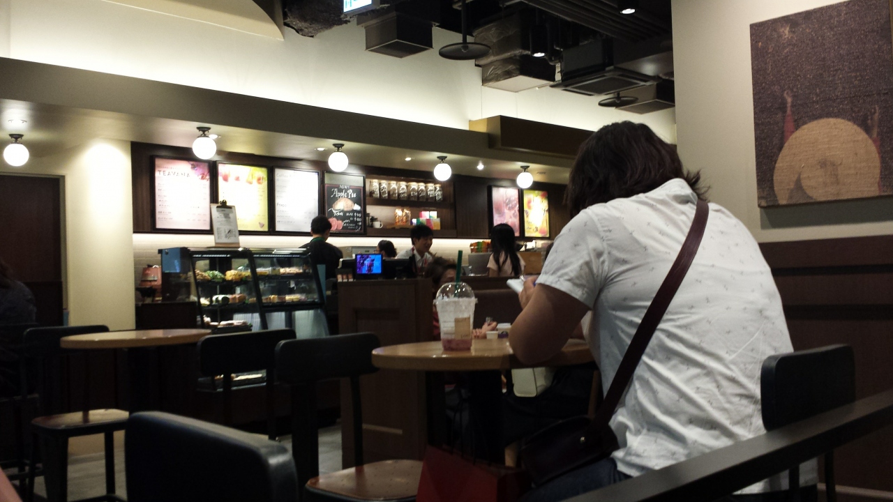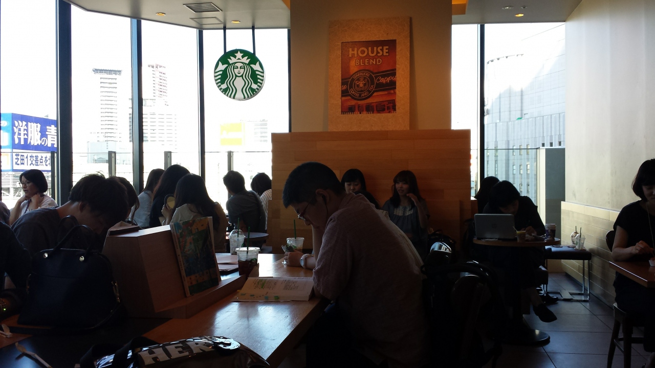 大阪の丸ビルの1階にあるスタバ。近くには大阪第一ホテルあり、ヒルトンあり、また伊丹空港の発着所でもあるので旅行者にとって利便性が高い立地にあり、時間つぶしにぴったりといえる。幸いそれほど混んでいない印象。
