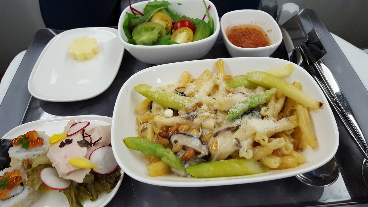 上海行で3万円弱と比較的安くチケット取れましたが、オーバーブッキングとのことでビジネスへアップグレードしてもらえました。クロスオーバーリワードのSPGプラチナステータスが効いてるのかしらん?とにかくラッキー。3時間弱の短いフライトでしたが、フルフラットの座席、なかなかの機内食、米系の割に行き届いたサービスなどデルタ航空に対する心象が一気に上がりました。