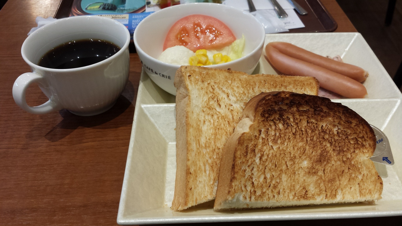 名古屋といえば喫茶。モーニング。ということで関東にもあるカフェドクリエにおいても朝食の時間帯はモーニングをやっている。300円台~と比較的安価でうれしい。朝のカフェで時間をとって朝食って結構贅沢で楽しい。