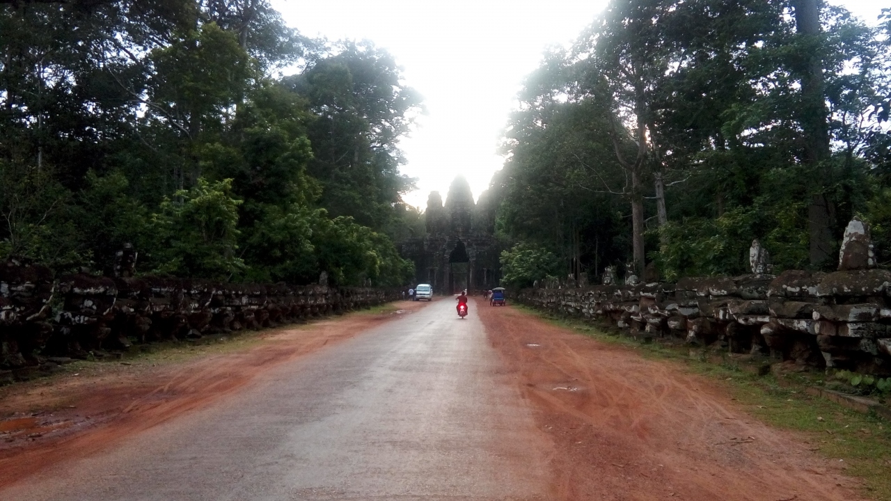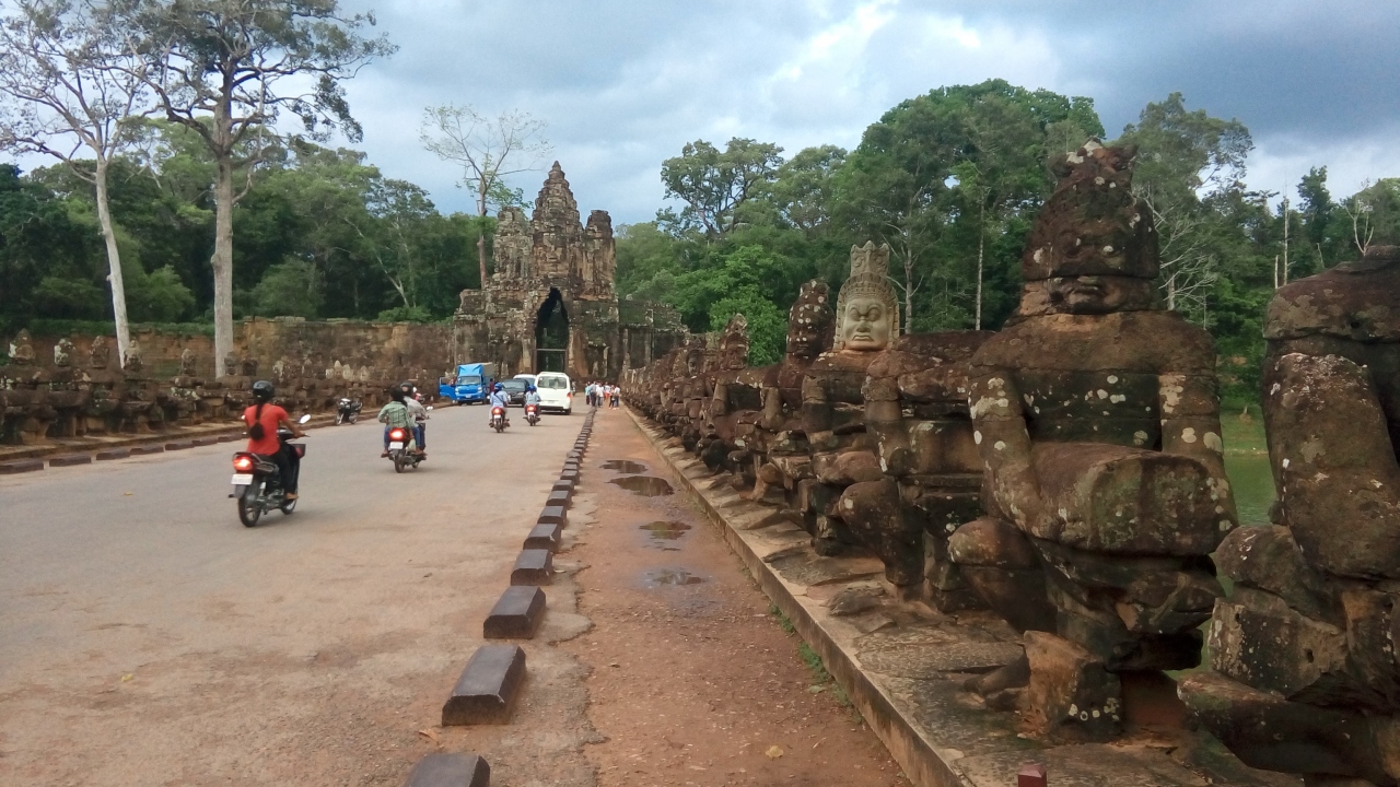 アンコールワットの北側に位置するアンコールトムへの入口。いまでも道路として機能しているので、観光客だけでなく、地元の人々が行きかいます。ここに来ると、まるで古代の城塞都市に迷い込んだような感じがして、テンションがあがりますね。