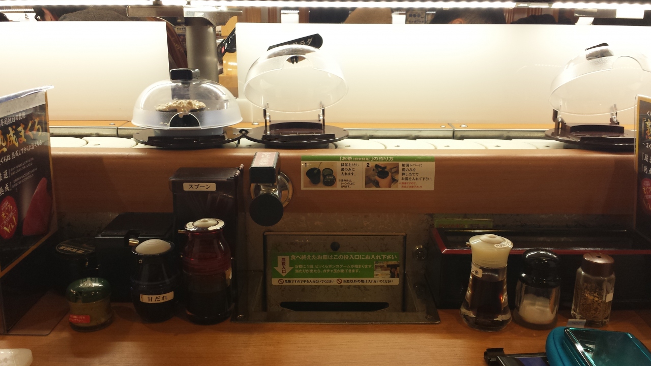 おなじみの100円均一回転ずし。驚いたことに回転ベルトが2階建てになっており、2階部分は特急で個別オーダーした寿司が高速で移動しています。外国人に受けそう。また食べたお皿は手前のスペースに押し込む仕掛けになっており、5皿ごとにクジ引きみたいなのに参加できる。エンターテイメントとしてはよい。肝心の寿司ネタはイマイチ。現金決済のみというのも不便。
