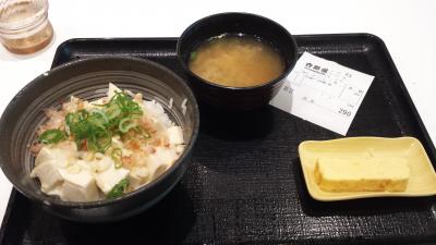 空港で食事をすると、高い!というのが全世界共通の認識。空港にあるチェーン店ではリーズナブルなセットメニューが消えていたり、娑婆にある店舗に比べて割高になっていたりするのだが、こちらの店舗はそんなことはない。よその店舗では朝食メニューが軒並み千円超えしているのに対し、こちらは豆腐物ぶっかけ飯で290円也。