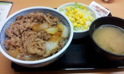 JR有楽町駅改札のすぐわきににある吉野家。おそらく吉野家全店の中でも一二を争う回転の速さになっていると思います。牛丼の並盛りサラダと味噌汁のセットを注文。これで50円オフのクーポンを使って350円なのだから破格のコストパフォーマンスですね。