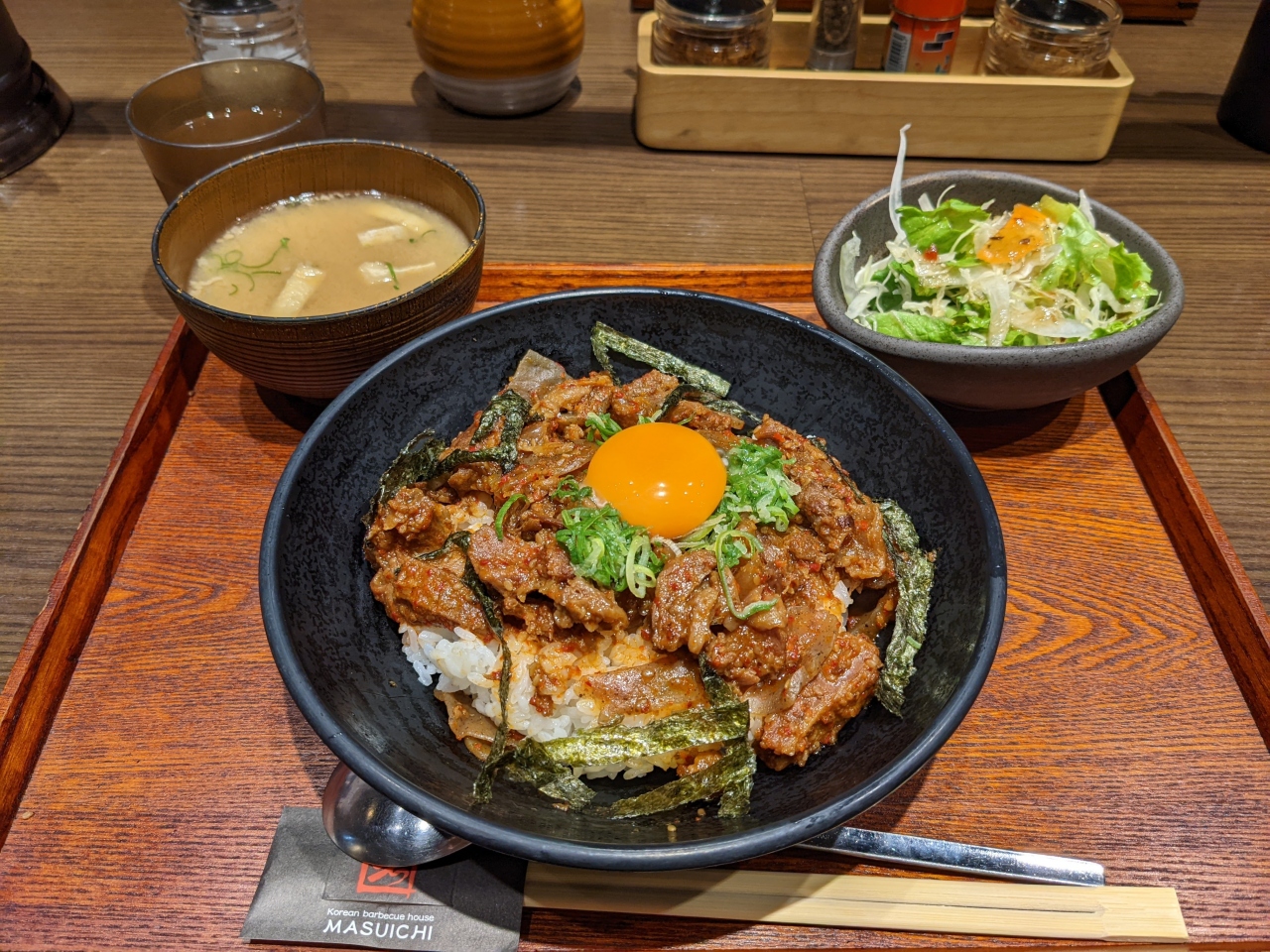 千日前のアーケード街の入り口にある大型のお店。ランチメニューを見てみると結構安かったので入店。焼肉定食は珈琲がついて1100円でした。ただし、肉はまあ値段なりかな、という印象です。お店は広々していて良かったです。