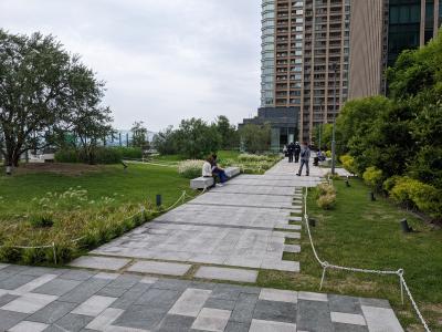 グランフロント大阪の7階から9会にかけて広がる屋上スペースでベンチなどが併設され。樹木が植林されています。眺望もなかなかのもので梅田の高層ビル群を眺めることができます。梅田駅からのは距離があるためか、ここまで来たら人も少ないですね。
