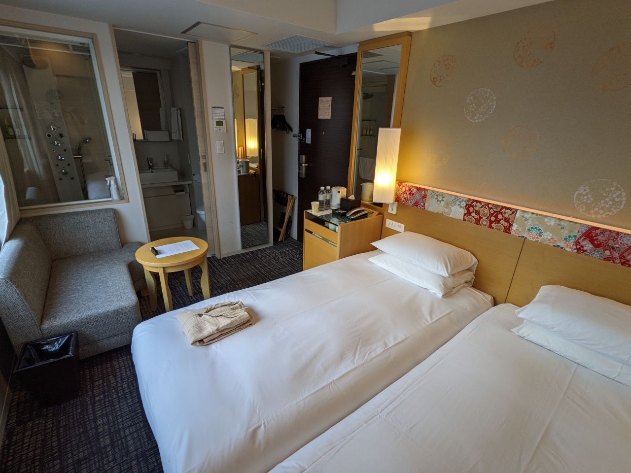 3千円ちょいのレートで宿泊。阪急に近いところに泊まりたかったため、立地でこちらを選びました。入り口は横道にあって大通りに沿いにはありません。海外でよく見るような都市型ホテルのような印象を受けます。大浴場とラウンジがあるのが特徴です。またお部屋には浴槽はないですがその分シャワーが高機能で快適でした。
