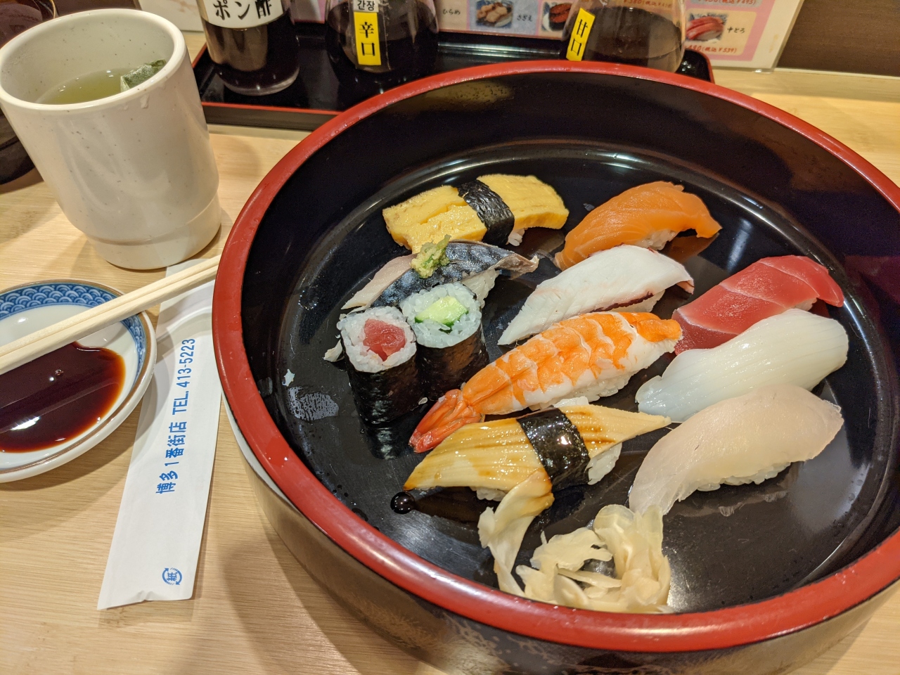 博多駅についてからサクッと食べるのに便利。JR博多シティ B1Fの入り口近くになありました。トクトク寿司なるセットだと税込みで千円ちょっとと文字通りお得です。15時過ぎでもOKでしたので遅めのランチはここが便利。味は普通。