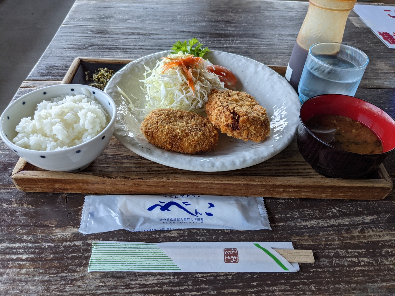 九重町にあるレストラン。眺めのいい山の中腹にあります。(やまなみハイウェイの道沿い)阿蘇の山々が見渡せてすがすがしい風景です。こちら豊後牛を使った定食のメニューがふんだんにありました。コロッケ定食をたのみましたたが、おいしいんだけどあまり牛を強く感じなかったの。お金がある人はステーキ行っちゃったほうが良いかも。