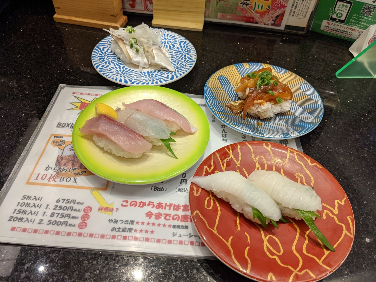 JR大分駅隣接のアミュプラザ内4階にある回転ずしのお店。場所柄大分初心者であっても気軽に訪問できる。目玉は間違いなく関サバ、関あじだが、数量限定のため必ず食べられるとは限らない。自分が行ったときは両方売り切れで残念。ほかにりゅうきゅう握りなどユニークなものも。