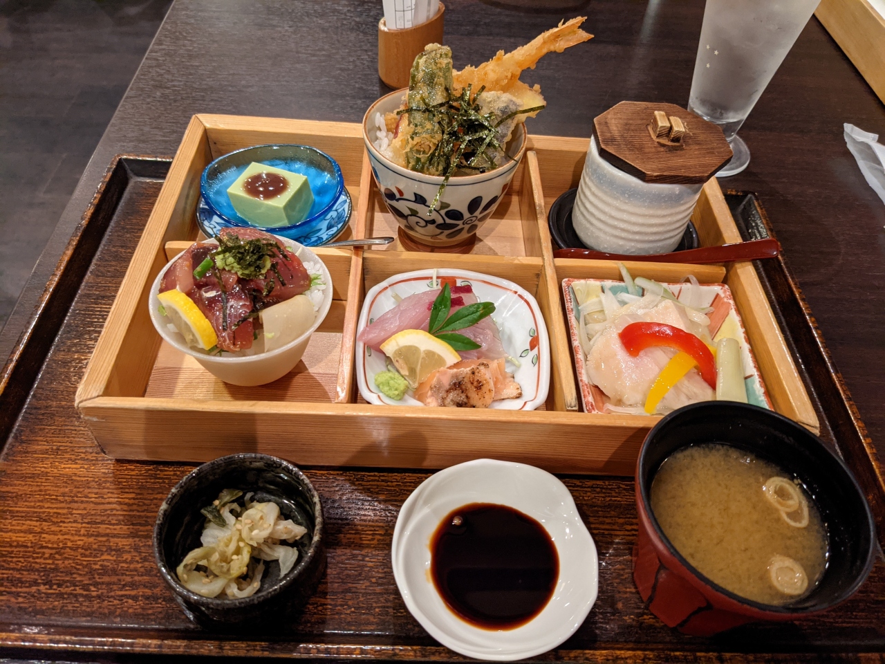 JR大分駅直結のアミュプラザおおいた 4Fにある魚介系レストラン。こちらのシグニチャーは何といってもランチで限定食の六マスご膳。大分名物がてんこ盛りで税込み1100円とかなりお得です。12時前に行けば食べれると思います。