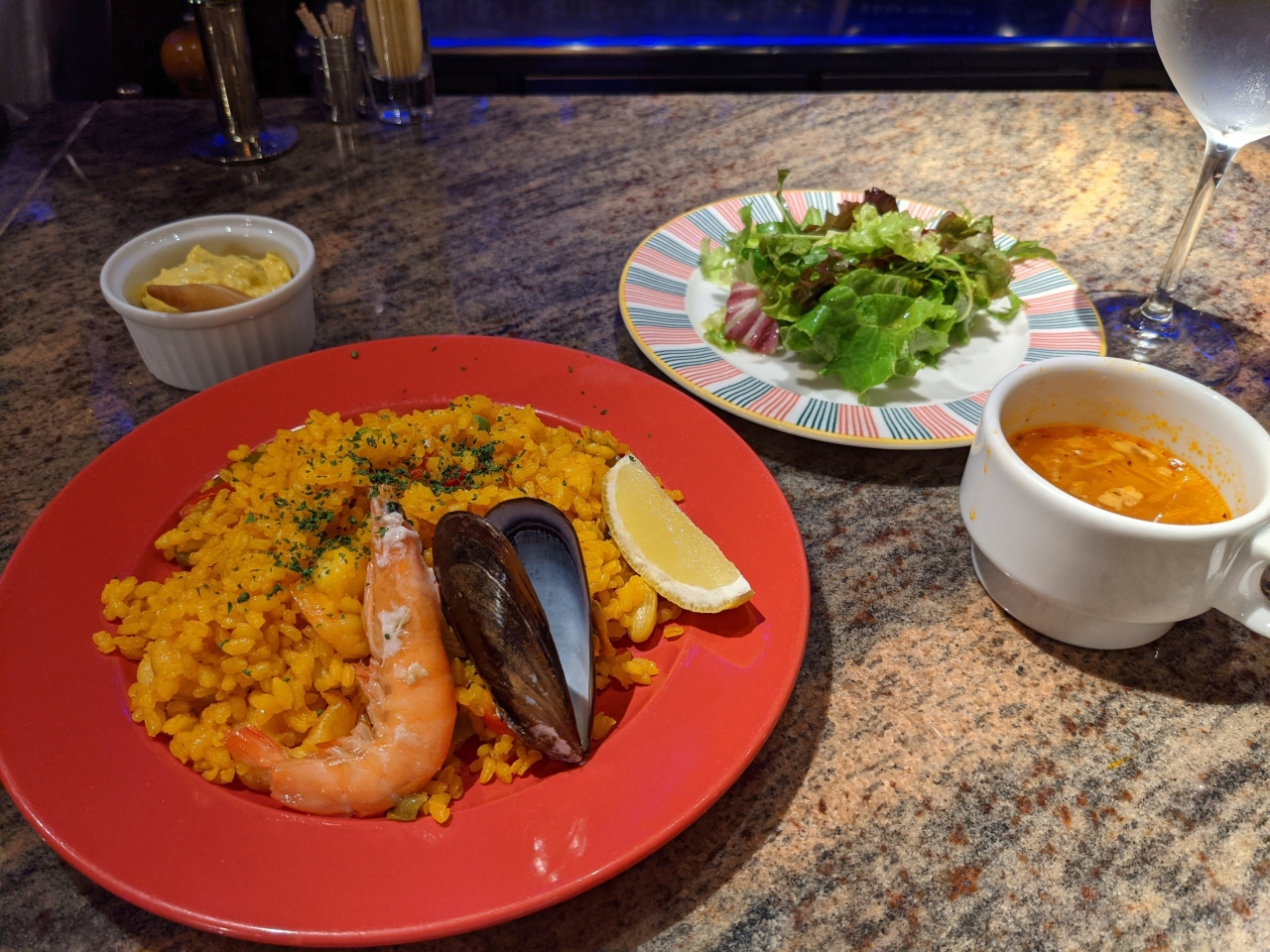 結構重厚感のある外見のスパニッシュレストランです。結構高そうな印象を持ちますが、ランチは1100円〜1200円と比較的リーズナブル。店内は所狭しとスペインのワインが並びます。パエリアを頼みましたがメニューの写真と違って実物はあまり具材が乗っていない感じでした。