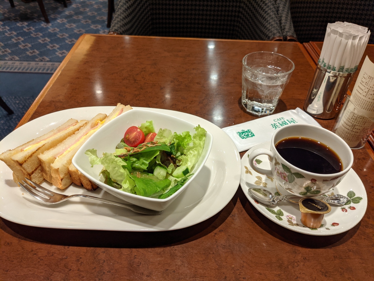 大阪ではよく見かける英国屋。東京ではほとんど見かけることはないので気にはなっていた。今回モーニングで行ってみた。なんばCITY店は地下一階にあります。コメダ珈琲の450円を基準とすると600円と少し高いが、内装が豪華であったり、カップがウエッジウッドであったりとワンランク上の感じはあるので良い。