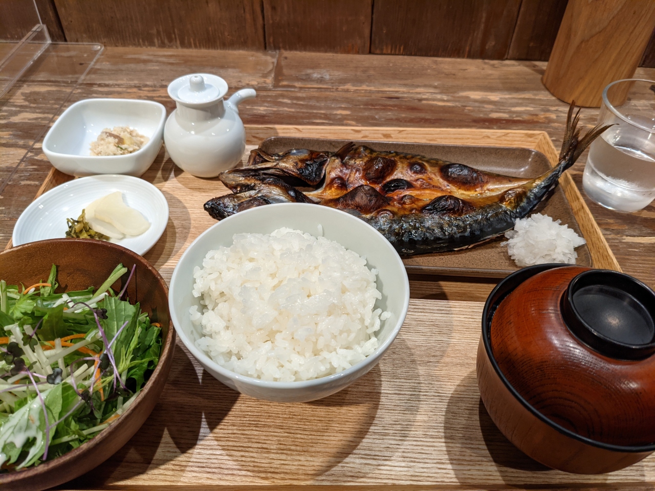 無印の東京旗艦店。数年前に有楽町から引っ越してきました。コロナ前は大混雑で地下一階の食堂は行列ができていたが今なら結構すいています。鯖定食で1150円と結構な値段だが、レンジでチンではなく、その場で焼いており、コーヒーもついてくるわけなので不満はない。