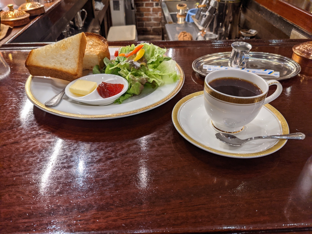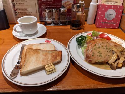 銀座の老舗のカフェ。結構なお値段なので朝以外で行くのはきびしい。ということでモーニングでやってまいりました。自分の前には一組待っている状態だった。モーニングでも820円と安くはないがまあ許容範囲。味は普通。コーヒーは浅入りで自分好みであった。銀座での朝飯は優雅な気分に浸れる。