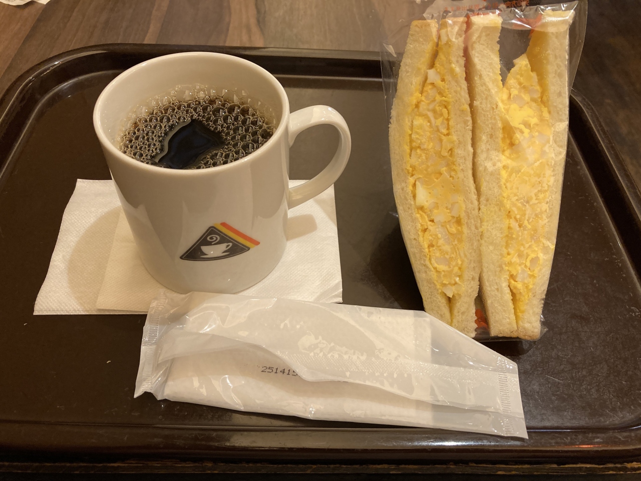 奄美大島のホテルで朝食なしプランで宿泊した場合などの朝ごはんはこちらがおすすめです。サンドイッチ代プラス100円でコーヒーーがついてきお得です。名瀬の郵便局の隣と、立地も良いです。地元の人で朝から賑わっていました。