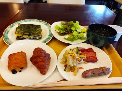 2020年オープンした話題のホテル、インディゴ強羅内のレストランです。朝食とバーを利用しました。まず目を引くのは派手なインテリアですね。特に天井の飾りは素晴らしいと思います。朝食はメインは4つのメニューからチョイスして、サラダやフルーツ、パン類はビュッフェ形式となっていました。
