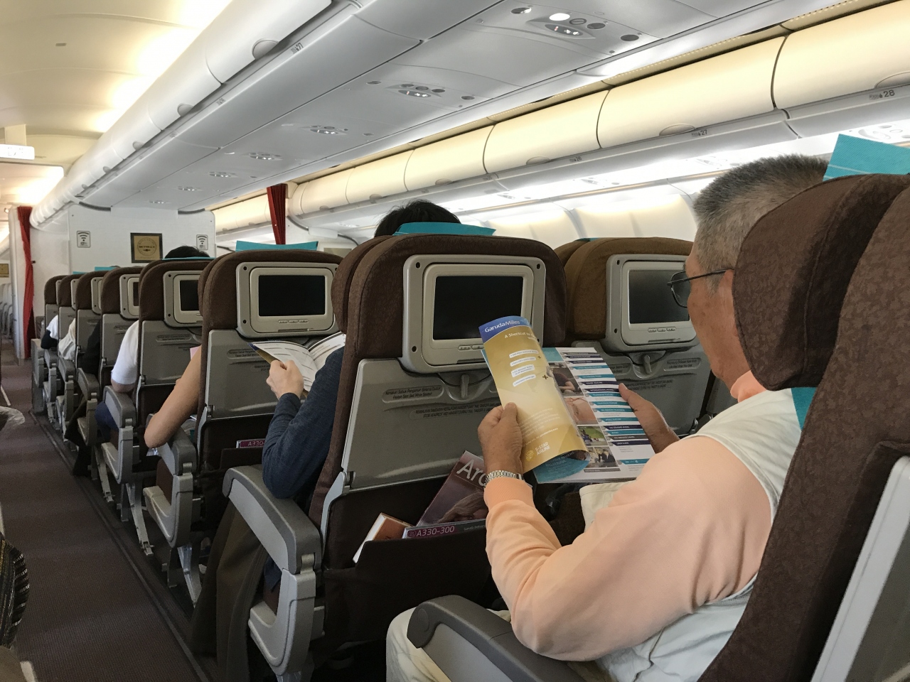 バリ島までの直行便。航空グループは違いますが、3月から全日空とのコードシェア便になりました。従って、ANA(スターアライアンス)のマイルが貯まります。CAには日本人が乗っているので言葉は大丈夫です。片言の英語で他のCAにも通じますが、愛想は良くないです。ただ、エアコンがぎんぎんに効いているので、絶体に長袖が必要です。靴下とアイマスクがなぜか支給されます。たいしたものではないので、靴下も必需品です。機内食は食べられますが、決して美味しいものではありません。